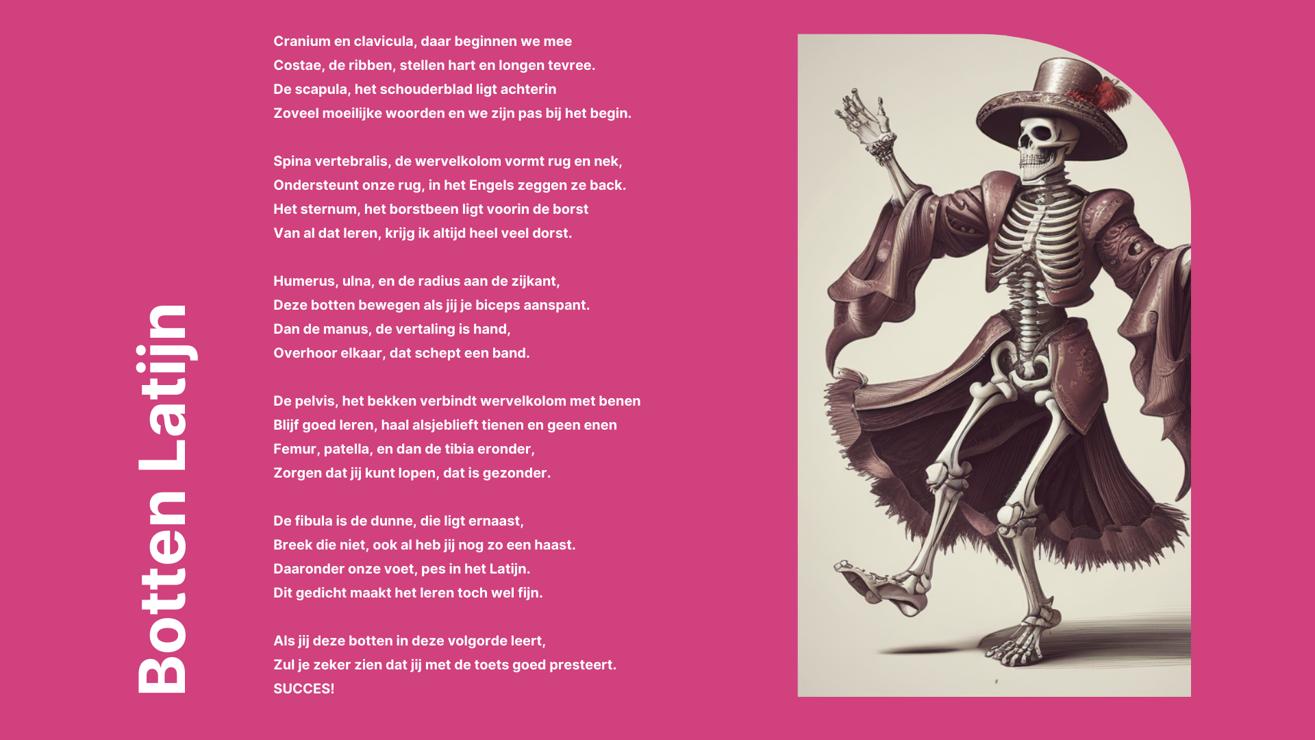 Deze gedichten helpen jou ezelsbruggetjes te vormen, de Nederlandse en Latijnse namen te onthouden en de functies van het menselijk lichaam beter te begrijpen.